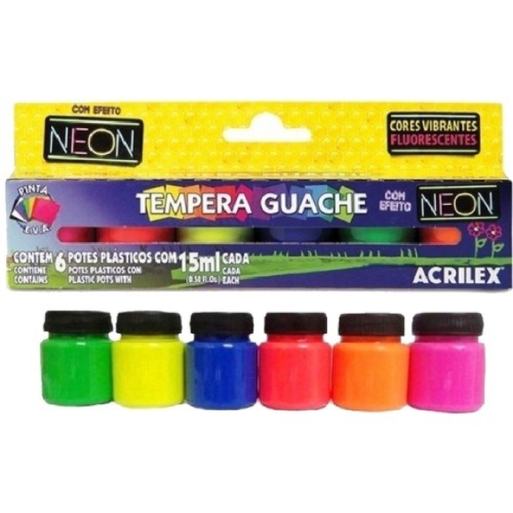 Tempera Guache Fantasia Neon Acrilex Contém: 6 cores em potinhos plásticos de 15ml cada