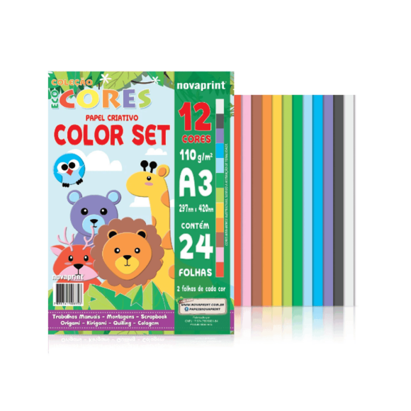 Papel Criativo Color Set A3, com ele você pode criar trabalhos manuais com montagens em tipo: Scrapbook, Origami, Kirigami, Quiling e colagem. Com 12 cores você irá descobrir o melhor do papel Color Set da Novaprint. Formato: 297 x 420mm. Cores: branco, preto, lilás, azul escuro, azul claro, verde escuro, verde claro, amarelo, laranja, marrom, rosa e vermelho (2 folhas de cada cor). Embalagem: 1 Bloco Com 24 Folhas.