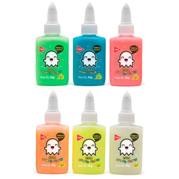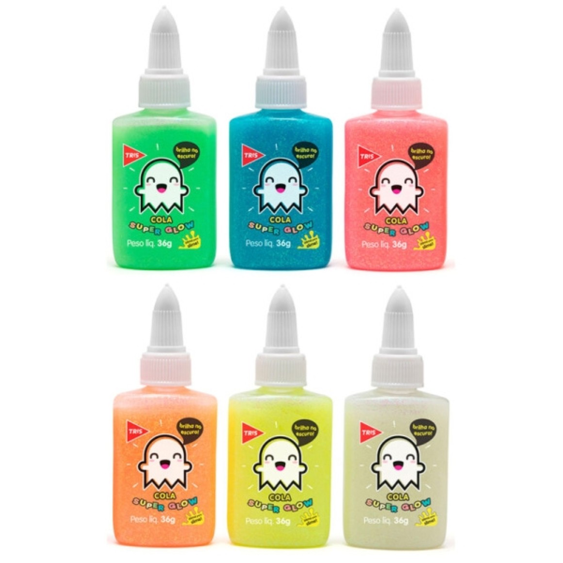 BRILHA NO ESCURO! Com bico dosador pra facilitar a aplicação nos seus trabalhos, a cola SUPER GLOW da TRIS é ideal para SLIME – a sensação da garotada – e é atóxica. Possui 6 cores incríveis com muito glitter fluorescente pra você escolher!