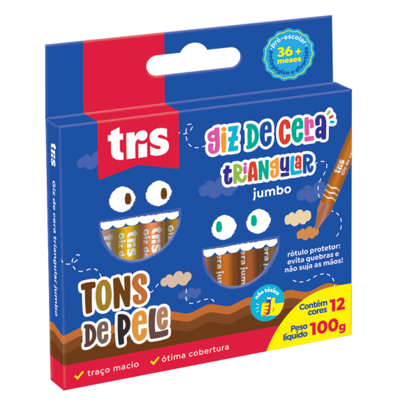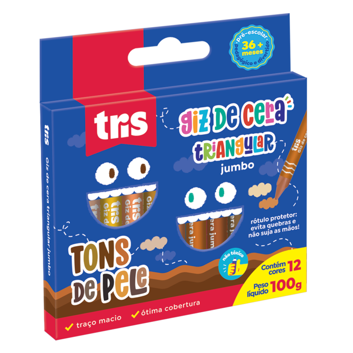 Nosso giz de cera JUMBO auxilia no aprendizado e estimula a criatividade, possui rótulo protetor que não suja as mãos e corpo triangular, que é ideal para as mãozinhas pequenas. É pré-apontado, de traço macio, ótima cobertura e atóxico. Agora em tons de pele!