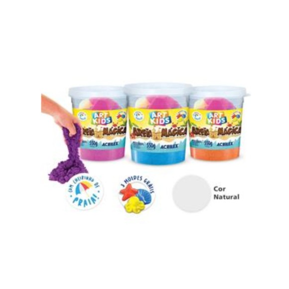 Areia Mágica 550g proporciona as crianças, uma incrível experiência sensorial, desenvolve a coordenação motora, habilidades manuais e a criatividade. Vem com 3 forminhas com tema praia para modelar.